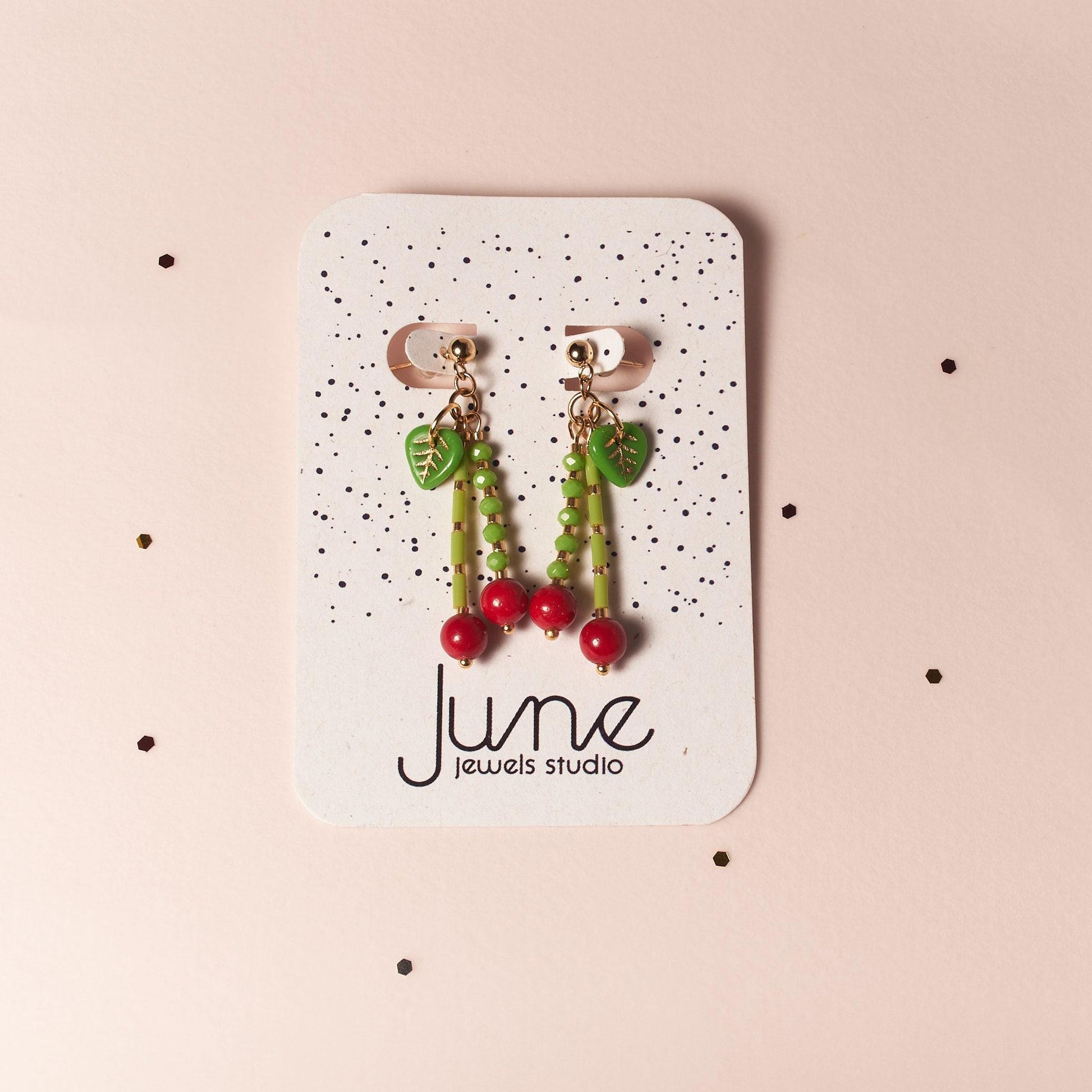 Handcrafted with a "burst of color," they combine Hot Red glass beads with delicate golden-accented green leaves, creating a whimsical cherry motif that is both trendy and timelessly charming.